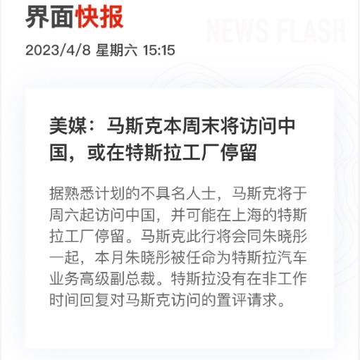 據彭博社報道,4月8日消息稱,特斯拉CEO馬斯克計劃于周六開始訪問中國,并可能停留在上海的特斯拉工廠。據知情人士透露,馬斯克將會同新任命的特斯拉汽車業務高級副總裁朱曉彤一起出訪。