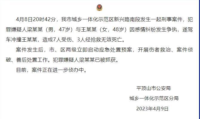8日晚,我市城鄉(xiāng)一體化示范區(qū)新興路南段發(fā)生一起嚴重刑事案件,由于一對男女因感情糾紛引發(fā)爭執(zhí),犯罪嫌疑人梁某某駕車沖撞女方王某某并致其死亡,造成7人受傷,其中3人經(jīng)搶救無效不幸身亡。