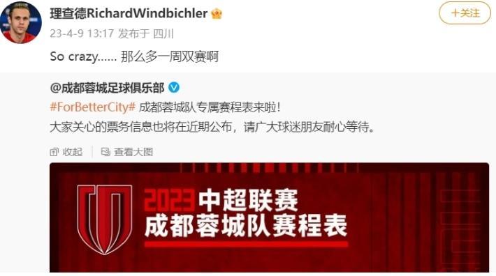 中超聯賽官方于4月8日公布了2023賽季的賽程安排,本賽季將于4月15日正式開幕,結束時間為11月4日,共進行30輪240場比賽。然而,成都蓉城隊的外援理查德-溫布里希勒在社交媒體上發文表示:So crazy…… 那么多一周雙賽啊(太瘋狂了,那么多一周雙賽啊)。這引發了不少球迷的關注。