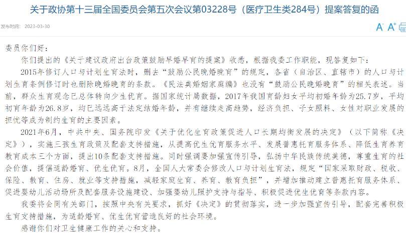 近期,全國政協(xié)委員提出建議政府出臺政策鼓勵早婚早育的提案,引發(fā)了廣泛關(guān)注。國家衛(wèi)生健康委員會(國家衛(wèi)健委)也在官網(wǎng)上公開了相關(guān)答復(fù)。答復(fù)中,國家衛(wèi)健委指出,當(dāng)前群眾生育觀念已經(jīng)總體轉(zhuǎn)向少生優(yōu)育,而政府的生育政策也從優(yōu)生優(yōu)育、提高優(yōu)生優(yōu)育服務(wù)水平、發(fā)展普惠托育服務(wù)體系、降低生育養(yǎng)育教育成本等方面出臺配套支持措施。同時,國家衛(wèi)健委還公開了多份關(guān)于生育問題的答復(fù)函,其中包括關(guān)于延遲退休對人口政策的影響、女性產(chǎn)假期間是否可以享受公積金繳存等問題的回答。