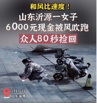 4月16日,山東淄博的沂源縣,一位名叫王女士的市民在去銀行存款的路上,手中的現金被大風吹散。幸運的是,銀行幾名工作人員和路人們紛紛相助,將失散的鈔票撿拾回來,并及時交還給了王女士。