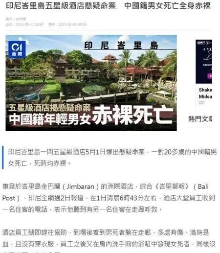 5月1日,在印尼巴厘島的洲際酒店發(fā)生一起令人驚恐的命案,兩名中國游客不幸身亡。這對年輕的20多歲的男女,住在該酒店4223房間,男性死者被發(fā)現(xiàn)躺在酒店走廊的露臺(tái)上,渾身是血,而女性死者則躺在房間浴室內(nèi),全身赤裸,頸上有纏繞的傷口。案件正在當(dāng)?shù)鼐降恼{(diào)查中,目前還無法確定兩人是否被他殺或自殺。