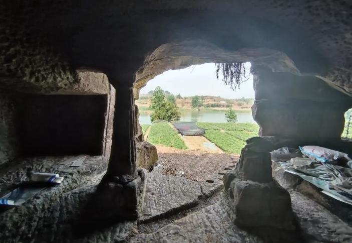 為了驗證劉春濤的觀點,紅星新聞前往自貢市大安區牛佛鎮進行了實地探訪。石室臨江而建,共“兩房九室”,進深八九米。右側房間內有6室,每個小房間有臺階,同樣也有石刻的屋檐。現場放置有一些現代物件,據稱是附近村民存放于此的。然而,關于該石室的來歷和用途,當地村民和政府官員也不得而知。據當地一位老支書初步了解,這是一座東漢時期的家族墓,但至今還沒有官方的確切考證,還待相關專家做進一步考察確認。