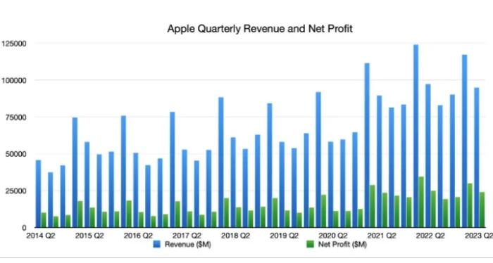 在今年一季度,蘋(píng)果公司的業(yè)績(jī)表現(xiàn)出乎市場(chǎng)預(yù)期。雖然消費(fèi)硬件相關(guān)公司的業(yè)績(jī)普遍疲軟,但是蘋(píng)果公司的iPhone業(yè)務(wù)卻成為了重要支撐。iPhone本季度的表現(xiàn)遠(yuǎn)超出市場(chǎng)預(yù)期,實(shí)現(xiàn)了同比增長(zhǎng)2%的營(yíng)收。這主要得益于全球工廠的全面復(fù)工以及亞太地區(qū)成為了新增長(zhǎng)點(diǎn)。特別是印度地區(qū),是蘋(píng)果最重要的增長(zhǎng)點(diǎn),預(yù)計(jì)到2025年印度市場(chǎng)將為蘋(píng)果貢獻(xiàn)年收入200億美元。此外,雖然Mac和iPad業(yè)務(wù)下跌明顯,但蘋(píng)果公司其他支線業(yè)務(wù)的發(fā)展總體比較平穩(wěn),沒(méi)有太大的亮點(diǎn)也沒(méi)有怎么拖后腿。