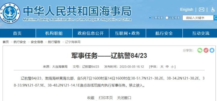 中國海事局網(wǎng)站發(fā)布消息稱,大連海事局發(fā)布了一則航行警告,通知自5月7日16時至5月14日16時,渤海海峽黃海北部將執(zhí)行軍事任務(wù),因此嚴(yán)禁任何船只駛?cè)朐搮^(qū)域。