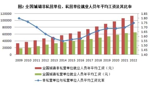 此外,數據顯示,自2015年以來,非私營單位與私營單位的平均工資差距持續擴大。如平均工資名義增速方面,私營單位人員增速高于非私營單位人員,但自2015年開始,非私營單位人員平均工資名義增速又超過了私營單位。而非私營單位人員平均工資與私營單位平均工資的比率也在擴大,至2022年,兩者倍差升至近9年的最高水平,為1.75,僅次于2009年、2010年。