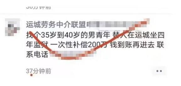 截圖顯示,該信息是通過微信朋友圈發布的。發布者要求找一個年齡在35歲到40歲之間的男性,替他人在運城坐四年監獄,作為補償,將一次性支付200萬元。信息末尾還留有聯系人電話。