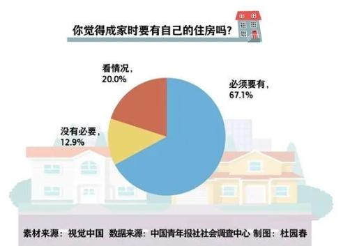最近,中國青年報社社會調(diào)查中心與問卷網(wǎng)(wenjuan.com)聯(lián)合對1512名年齡在35歲以下的年輕人進(jìn)行了一項調(diào)查。調(diào)查結(jié)果顯示,67.1%的受訪年輕人明確表示成家時必須要有自己的住房。同時,在一線城市居住、女性、已經(jīng)擁有自住房的受訪者中,對必須擁有自己住房的比例更高。
