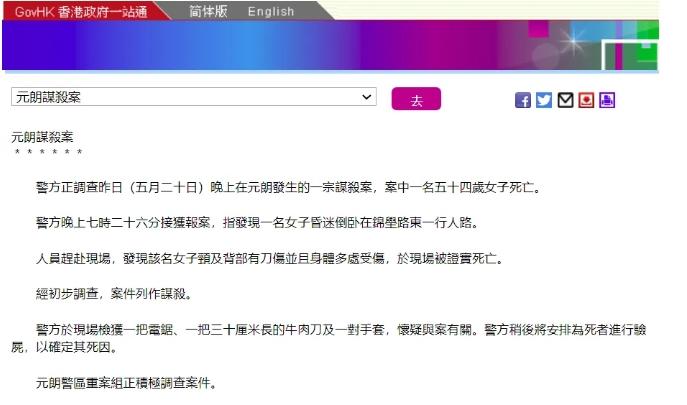 根據新聞公報,香港警方于20日晚7時26分接到報案,稱在元朗錦壆路東的人行道上發現了一名女子倒地不起。警方立即趕到現場,發現這名女子的頸部和背部有刀傷,身體多處受傷,經初步調查證實其已經死亡。警方將此案列為謀殺。