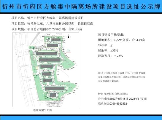 山西省忻州市規(guī)劃和自然資源局官網(wǎng)于5月18日發(fā)布了《忻州市忻府區(qū)方艙集中隔離場所建設項目選址公示牌》,公示顯示該項目總占地面積2.2996公頃,位于牧馬路以東、九龍崗森林公園以西、長征街以南。公示時間為5月18日至5月31日。