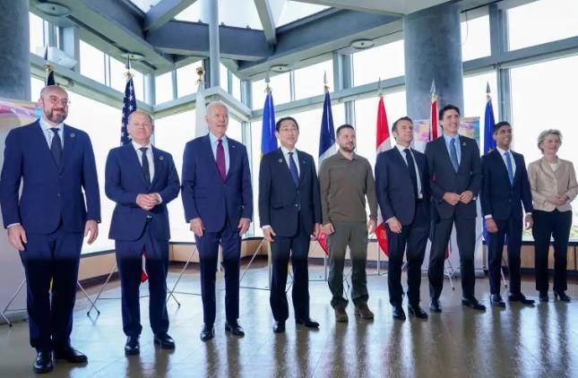 日本廣島時間5月21日,七國集團(G7)領導人在廣島就烏克蘭問題舉行了工作會議。烏克蘭總統澤連斯基于20日抵達廣島參加會議,并在21日的會前合影中站在各國領導人的正中央。