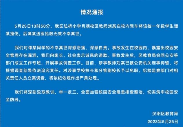 根據武漢市漢陽區教育局發布的情況通報,我區弘橋小學月湖校區的一名教師劉某在5月23日13時50分發生了一起意外事件,導致該校一名一年級學生譚某不幸身亡。