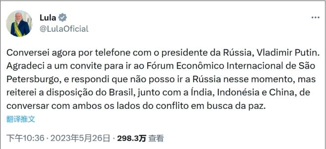 盧拉在推特上寫道:“我剛剛與俄羅斯總統(tǒng)弗拉基米爾·普京通了電話。我感謝他邀請我參加圣彼得堡國際經(jīng)濟論壇,并回答說我目前不能去俄羅斯。但我重申,巴西愿意與印度、印度尼西亞和中國一道,與沖突雙方開展對話,追求和平。”