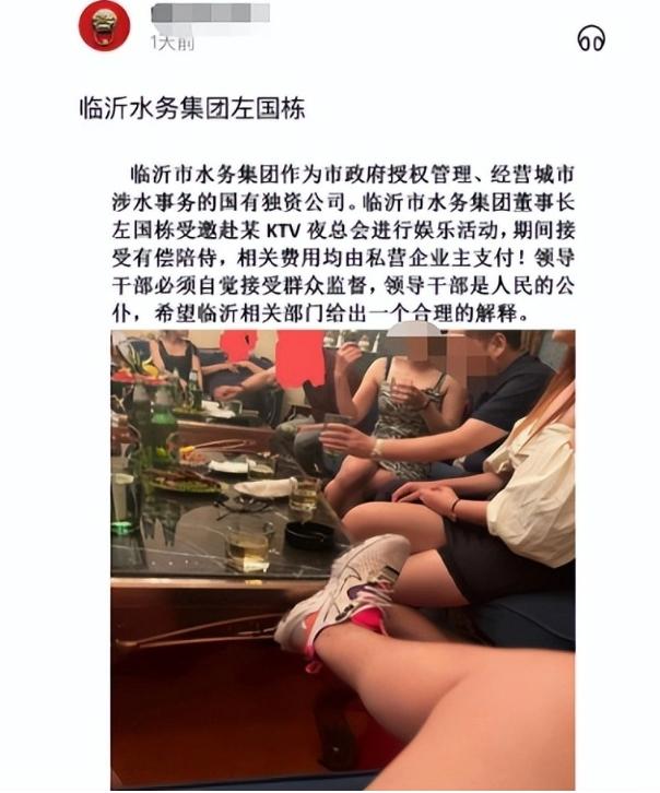 5月28日,據(jù)瑯琊新聞網(wǎng)報道,臨沂水務集團董事長左囯棟被曝涉嫌在某KTV夜總會接受有償陪侍。消息經(jīng)相關部門核實,確認情況屬實。