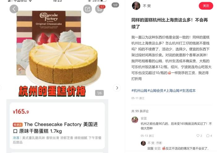 近日,一則關(guān)于山姆超市干酪蛋糕價格差異的帖子在社交平臺上引起了廣泛討論。該帖指出,在杭州地區(qū),山姆超市一款干酪蛋糕售價為165.9元,而在上海地區(qū),價格僅為95.1元,差價高達70元以上。這一情況引發(fā)了網(wǎng)友對山姆超市地區(qū)價格差異的質(zhì)疑和關(guān)注。
