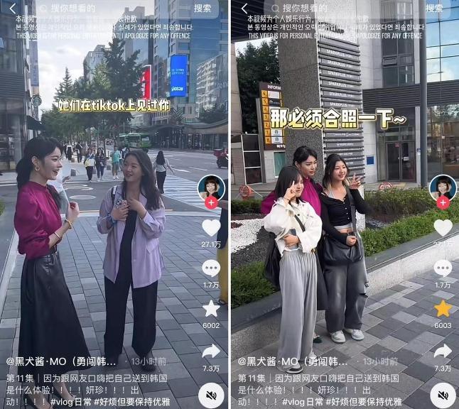在此之前,“黑犬醬”在自己的抖音賬號上發布了一段仿妝視頻,扮演了“妍珍”一角,粉絲們紛紛表示相似度非常高,并希望她能夠在韓國街頭亮相。她回復稱只有在視頻獲得100萬點贊時才會去,當時她覺得這個目標幾乎不可能實現。然而,隨著點贊數量的飆升,她決定兌現承諾,購買了機票前往韓國。截至目前,她原始的仿妝視頻已經獲得了275.5萬的點贊量。