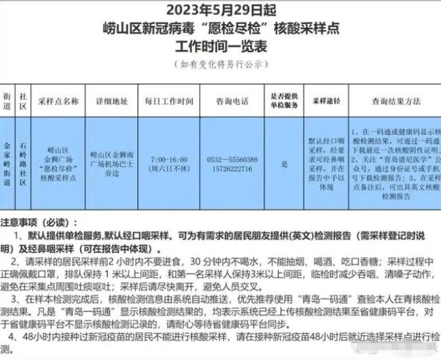 根據嶗山區衛生健康局公眾號的消息,從2023年5月29日開始,嶗山區設立了新冠病毒核酸采樣點,并公布了工作時間一覽表。以下是注意事項,請大家仔細閱讀: