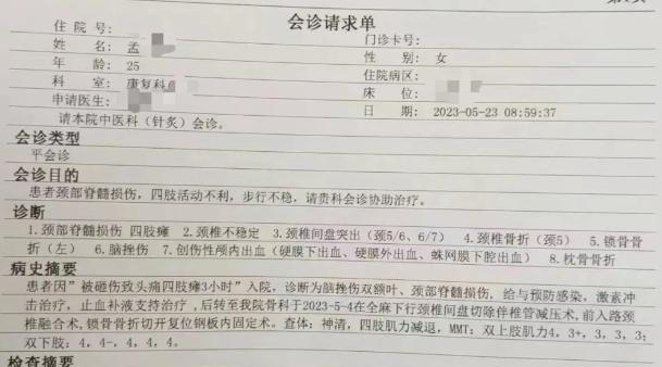 孟女士的媽媽回憶道,5月23日,孟女士被轉入康復科進行治療。當天的會診單顯示,孟女士頸部脊髓受損、四肢癱瘓,頸椎不穩定,頸椎間盤突出,頸椎、鎖骨和枕骨骨折,還伴有腦挫傷和創傷性顱內出血。經過一周的康復治療,到了5月31日,孟女士已經能夠下床行走,雖然行走時仍稍顯搖晃,但上半身已經能夠活動,并且能夠自己翻身。