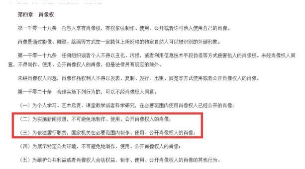 根據《中華人民共和國民法典》第一千零二十條的明確規定,在新聞報道中為了實施報道,制作、使用和公開肖像權人的肖像是無法避免的;在依法履行職責的情況下,國家機關可以在必要范圍內制作、使用和公開肖像權人的肖像,而無需經過肖像權人的同意。