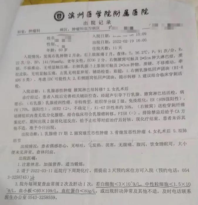 然而,2022年春節(jié)前,黃亞琴開始感到不適,于是前往濱州醫(yī)學院附屬醫(yī)院進行檢查,結(jié)果發(fā)現(xiàn)她患有乳腺癌IV期臨床晚期。