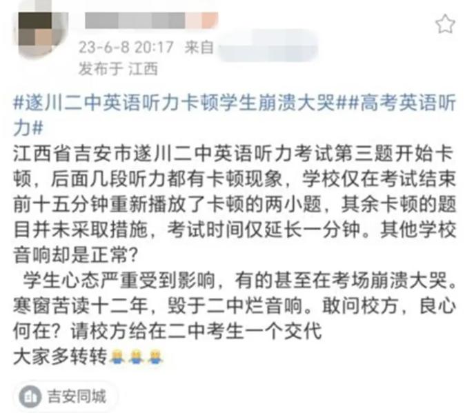 有報(bào)道顯示,遂川二中考點(diǎn)的考生們表示,在英語(yǔ)聽(tīng)力考試中,大約有10道題目出現(xiàn)了卡頓現(xiàn)象。在下午16時(shí)30分,廣播宣布將重新播放聽(tīng)力內(nèi)容,而在16時(shí)45分,重新播放了其中的兩道題目。這樣的情況導(dǎo)致許多學(xué)生含著眼淚離開(kāi)了考場(chǎng)。