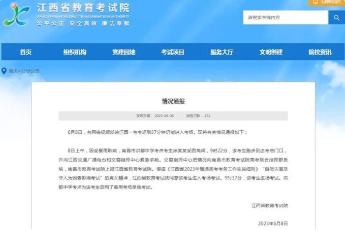 6月8日,一則網絡視頻反映了江西一名考生遲到37分鐘仍然能夠進入考場的情況。針對此事,江西省教育考試院發布通報稱,根據《江西省2023年普通高考考務工作實施細則》中有關“自然災害及非人為因素影響考試”的規定,該考生被允許進入考場參加考試。考生于9時37分進場考試,考點為其啟用了備用考場進行單獨考試。
