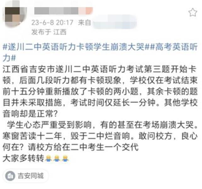 該名江西吉安網友在帖文中表示:“遂川二中高考英語聽力考試從第三題開始出現卡頓,后續幾段內容也都有卡頓現象。學校在考試結束前十五分鐘重新播放了卡頓的兩個小題,但對其他卡頓的題目沒有采取措施,考試時間僅延長了一分鐘。因此,一些考生在考場內情緒崩潰,大聲哭泣。”