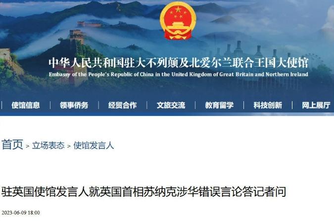 據中國駐英國大使館網站6月9日消息,駐英國使館發言人就英國首相蘇納克涉華錯誤言論答記者問。