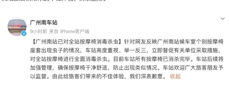 廣州南車站在微博上于6月12日凌晨發布了一則聲明,針對網友反映廣州南站候車室部分按摩椅座套出現蟲子的情況,表示車站高度重視并立即采取行動。車站督促有關單位采取措施對全站的按摩椅進行全面消毒殺蟲,目前已完成按摩椅的消殺工作。為了避免類似情況再次發生,車站將加強管理,確保按摩椅的干凈和舒適,并歡迎廣大旅客朋友監督。車站對給旅客們帶來的不好體驗表示深深的歉意。