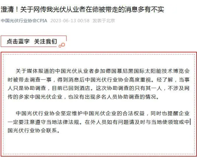 中新經緯6月13日電 13日,中國光伏行業協會CPIA微信號發布了一份澄清公告,針對網傳的光伏從業者在德國被帶走的消息進行澄清。