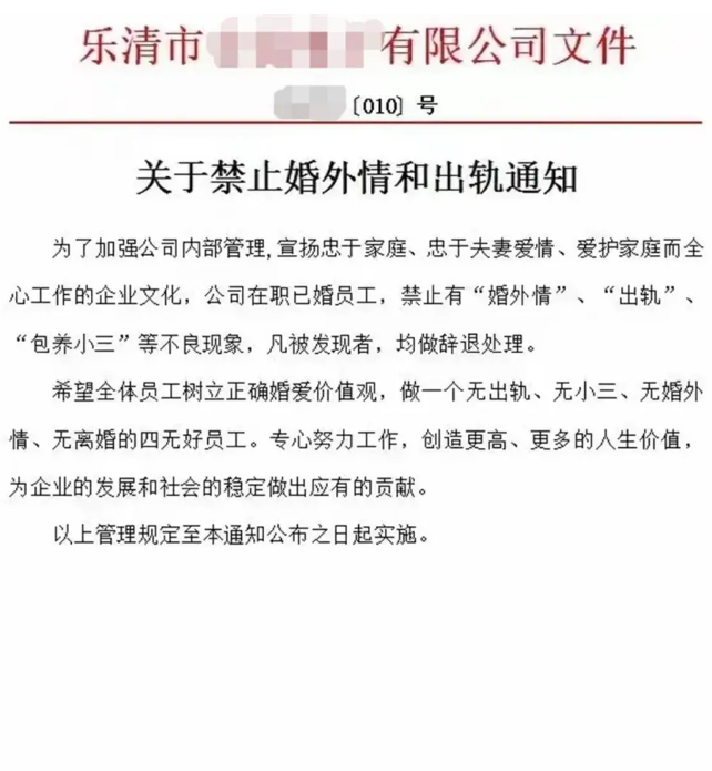 近日,一家位于浙江溫州樂清市的企業發布了一則名為“關于禁止婚外情和出軌通知”的紅頭文件,其中指出已婚員工若有婚外情、出軌、包養小三等不良行為,將會被辭退處理。據該公司回應極目新聞稱,該通知的目的是倡導員工保持家庭和諧,以維護工作的穩定。不過,律師指出,如果員工因此被辭退,可以依法維權。