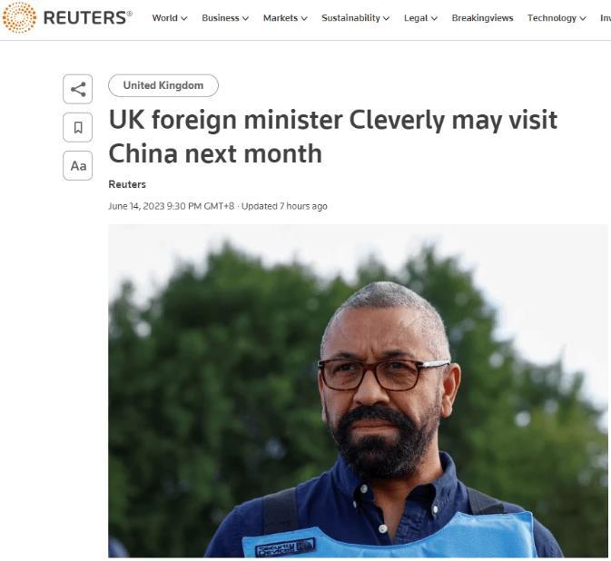據(jù)了解,路透社消息人士透露,英國外交大臣詹姆斯·克萊弗利可能于今年7月訪問中國。這一計劃出現(xiàn)在中英兩國正努力穩(wěn)定當前陷入數(shù)十年來最低點的動蕩關(guān)系之際。