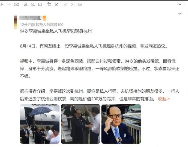 據(jù)照片拍攝者介紹,李嘉誠(chéng)此次到杭州可能是個(gè)人行程,并且有許多朋友前往機(jī)場(chǎng)迎接他。他與好友一同游覽了杭州的西湖,并品嘗了價(jià)值200萬(wàn)的龍井茶。