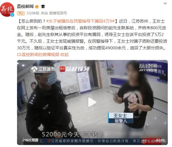 近日,江蘇蘇州發生了一起詐騙案件。一位名叫王女士的人在網上發布了一則房屋出租信息,隨后接到自稱投資顧問的趙先生的聯系,并支付了800元作為定金。然后,趙先生聲稱他所從事的投資平臺存在漏洞,引導王女士投資了5萬2千元。不久后,王女士發現自己被騙,遂報警。在民警的指導下,王女士為了追回損失,謊稱還要投資30萬元,并以驗證平臺真實性為借口成功提現了超過49000元,成功挽回了大部分損失。
