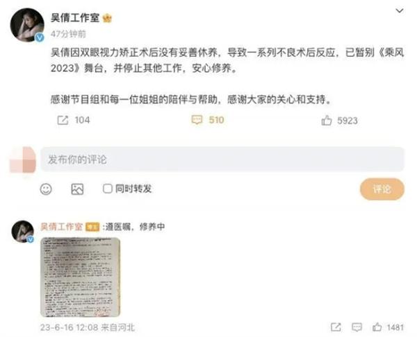 吳倩的工作室表示,吳倩由于雙眼視力矯正術后沒有得到充分休養,導致了一系列不良術后反應。因此,她決定暫時離開《乘風2023》舞臺,并停止其他工作,全心投入修養。工作室還在評論區分享了武漢大學人民醫院出具的出院記錄,并留言表示吳倩會遵醫囑進行修養。