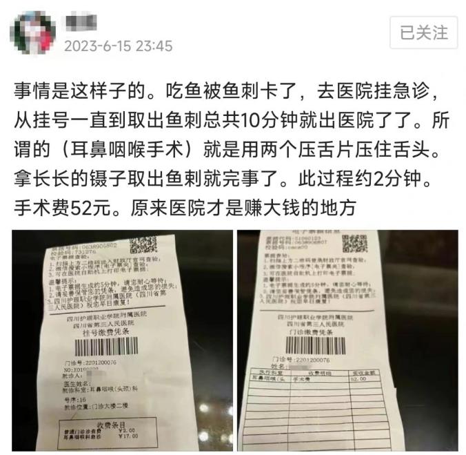 近日,四川一位女子在今日頭條上發(fā)帖吐槽自己因魚刺卡喉去醫(yī)院掛急診,手術(shù)費只花了52元,引起了爭議。原本她想質(zhì)疑醫(yī)院收費不合理,但在評論區(qū)卻遭到眾多網(wǎng)友的反駁,認(rèn)為她的質(zhì)疑不合理。