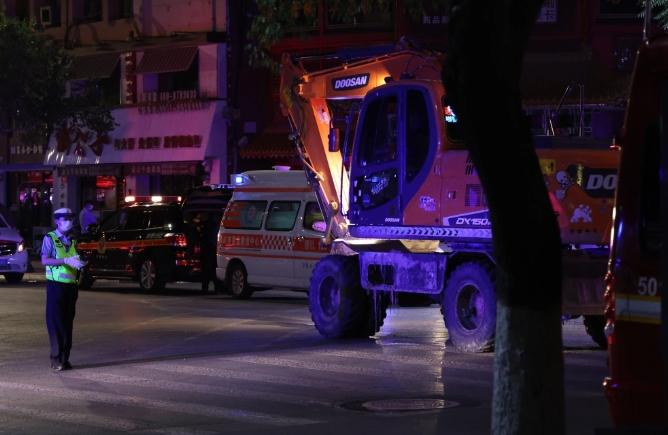約在晚上11點50分左右,有挖掘機進入爆炸現場展開救援工作。