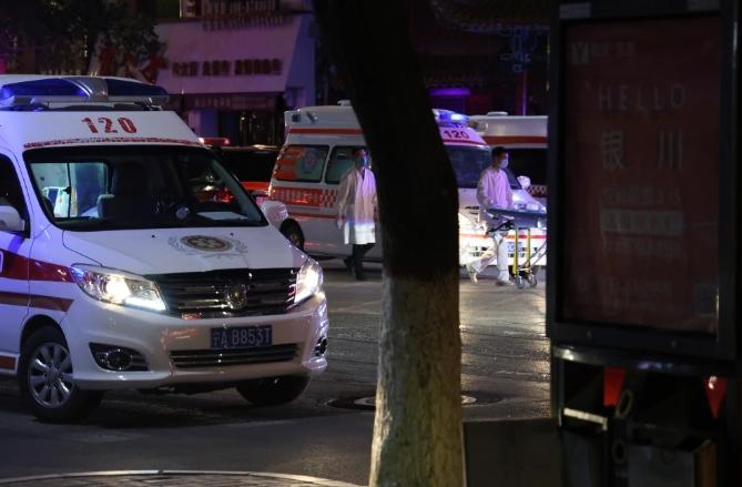 凌晨1點20分左右,仍有救護車在爆炸現場來回穿梭。
