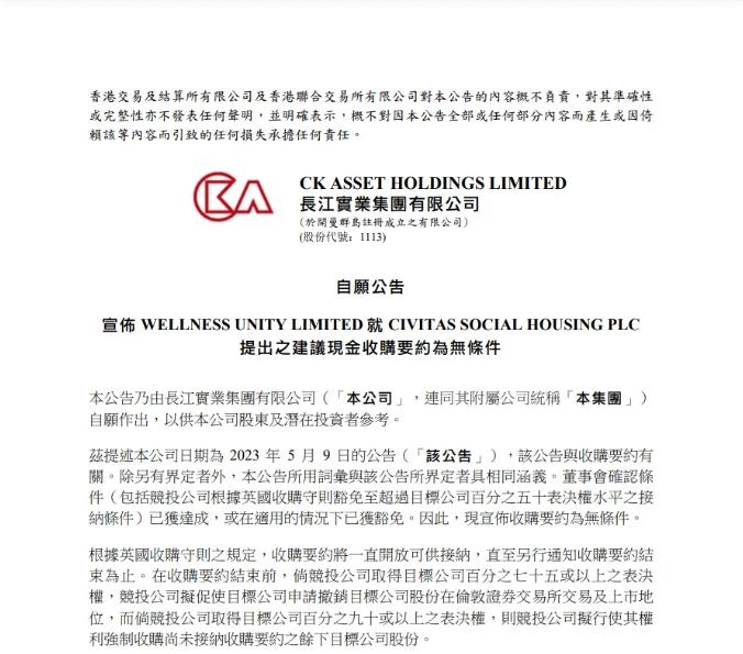 李嘉誠家族旗下的長江實業集團(HK00001)近日發布公告,子公司WELLNESS UNITY LIMITED成功收購了英國上市的房地產投資信托基金Civitas Social Housing PLC。這項收購交易已經達成無條件要約。據悉,李嘉誠家族的第三代成員李思德在這則公告中首次亮相,并擔任長實集團企業業務發展部經理的職位。