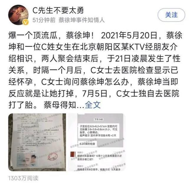 根據爆料,蔡徐坤被指與一位女性在北京某KTV發生,并導致該女性懷孕,最終進行了墮胎手術。這一事件的曝光震驚了粉絲和公眾,人們對于蔡徐坤的道德觀念和行為進行了深入的思考。