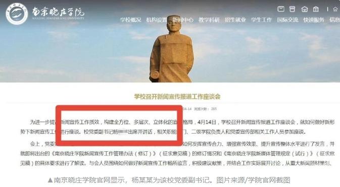 經過上游新聞(報料郵箱baoliaosy@163.com)記者在南京曉莊學院官網的查詢,確認楊某某確實是該校的黨委副書記。