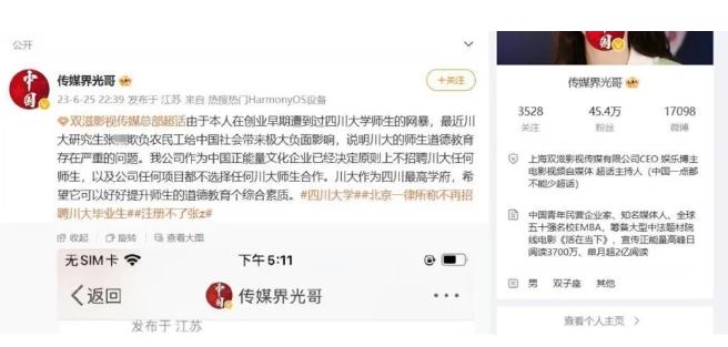 楊先生于25日晚在其微博賬號“傳媒界光哥”上發文,表示由于他個人在創業早期曾遭到四川大學師生的網絡暴力,最近川大研究生張某欺負農民工的事件也給社會帶來了負面影響。作為一家以中國正能量文化為核心的企業,該公司已原則上決定不招聘川大的任何師生,任何項目都不會選擇與川大師生合作。