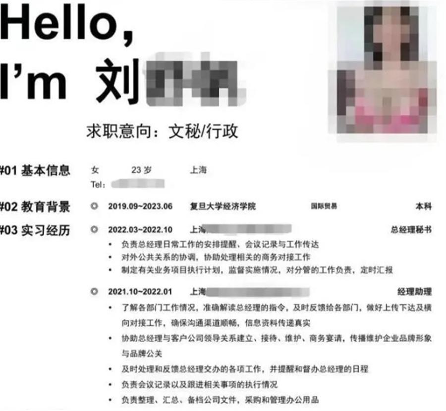 6月26日,一則消息在網絡上傳播,稱一名畢業于復旦大學的本科生的求職簡歷中含有不雅照片。簡歷顯示該學生名為劉某某,為復旦大學2019級經濟學院國際貿易專業本科生,曾在上海的兩家企業實習,擔任總經理秘書和經理助理職位。簡歷中還包含了專業技能、自我介紹以及一個手機號碼。