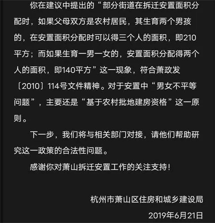 近日,一條微博引發了對杭州市蕭山區拆遷政策的質疑。據微博網友反映,如果父母雙方均為農村居民,生育兩個男孩時在安置面積分配上可得到三個人的面積,而生育一男一女則只能得到兩個人的面積。這引發了對男女不平等和違反《中華人民共和國婦女權益保障法》的討論。