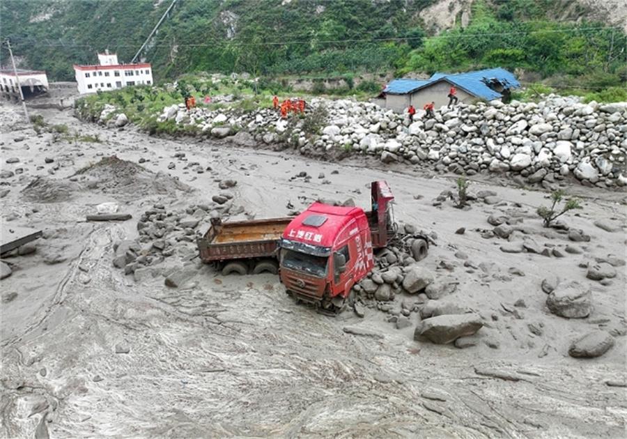 2023年6月27日,四川阿壩,汶川縣綿虒鎮(zhèn)板子溝泥石流災害現(xiàn)場。請大家密切關注相關部門發(fā)布的最新消息,做好自我防護和災害應對準備。