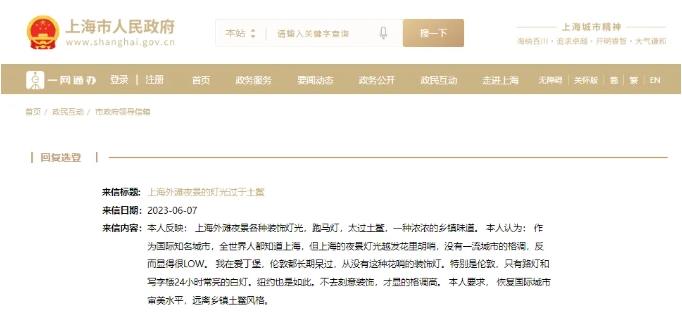 近日,一位網(wǎng)友在上海市政府領(lǐng)導(dǎo)信箱留言抱怨上海外灘夜景燈光過于花哨,缺乏一流城市的格調(diào),甚至形容其帶有鄉(xiāng)鎮(zhèn)味道。這一言論引發(fā)了廣泛討論和關(guān)注。