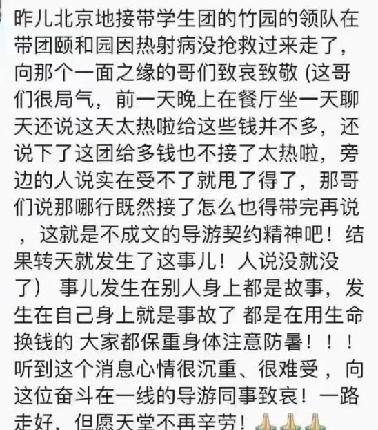 據(jù)北京多位導(dǎo)游處了解,7月2日,一名地接導(dǎo)游在頤和園帶團(tuán)游覽時(shí)因中暑被送醫(yī),經(jīng)過(guò)搶救無(wú)效后不幸離世。