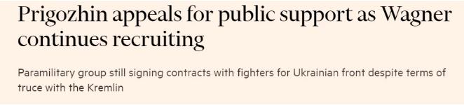 報(bào)道指出,這一舉動(dòng)與此前俄羅斯官方與瓦格納集團(tuán)達(dá)成的“休戰(zhàn)條款”相矛盾。普里戈任在電報(bào)頻道發(fā)布的信息中表示,瓦格納集團(tuán)將繼續(xù)為對(duì)烏特別軍事行動(dòng)招募士兵,并呼吁俄羅斯民眾支持他的私人武裝部隊(duì)。他在感謝俄羅斯國(guó)內(nèi)支持者時(shí)表示,“我們比以往任何時(shí)候都更需要你們的支持”。