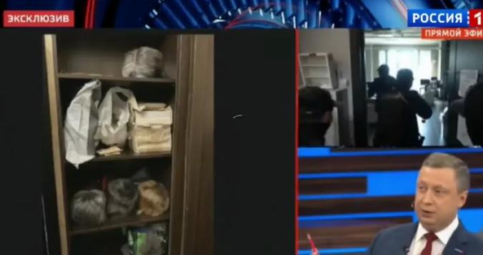 根據《俄羅斯商業咨詢日報》網站的描述,畫面顯示俄羅斯聯邦安全局的執法人員進入普里戈任的辦公室,發現了裝滿錢的紙箱。此外,他們還在搜查地點找到了武器和彈藥筒、幾本護照、金條和現金等物品。