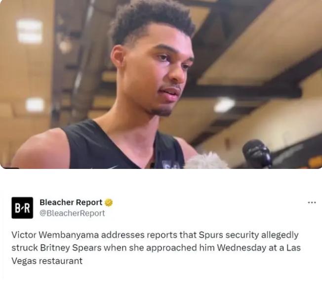 近日,著名歌星“小甜甜”布蘭妮聲稱在拉斯維加斯遭到文班亞馬身邊的馬刺安保人員掌摑的事件,引起了廣泛關注。此前,文班亞馬還未在馬刺首秀,就卷入了這起沖突事件。雙方對事件的經過存在不同的陳述,雙方各執一詞,成為全美熱搜的焦點。